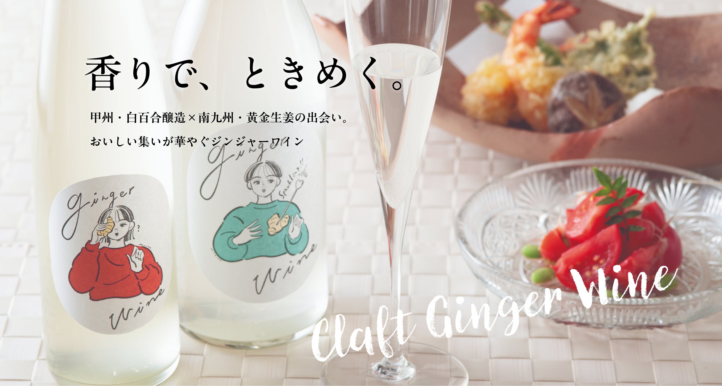 ジンジャーワインは、今までのカテゴリーに収まらないフレーバードワインです。ベースとなる高品質な日本産の白ワインに、黄金生姜のフレッシュな香りを加えることで、新しい味わいを実現。食前酒やデザートワインとしてもお楽しみください。